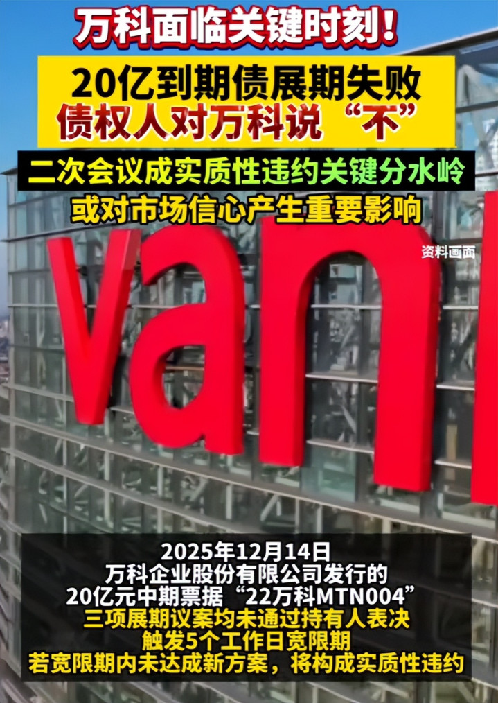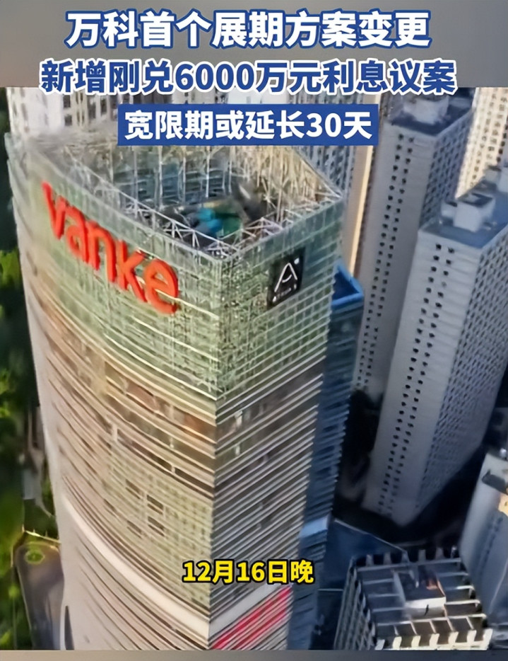 哈喽,大家好!我是你们的小陆,房地产巨头万科在一次站到了风口浪尖,12月15号官方消息报道万科的20亿中票展期方案全部被否定,这就意味着现在的万科正面临着关键时刻,不过收割展期方案变更,新增刚兑6000万元利息议案,宽延期或延长30天,那这次万科究竟能否躲过这一劫呢?